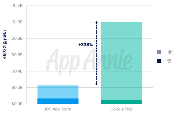 양대 스토어 합산 시 게임은 2분기 글로벌 소비자 지출액의 75%을 차지했다. 전년비 게임 앱 지출액은 구글플레이가 20%, iOS가 15%씩 증가했다. 구글플레이에서의 국가 별 게임 지출액 순위는 미국, 일본, 한국 순이었다. iOS의 경우 중국, 미국, 일본이 각각 순위에 랭크됐다.