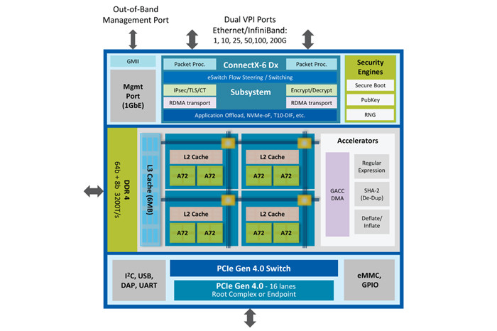 블루필드 시스템온칩(SoC)는 멜라녹스 인터커넥트 솔루션을 구동하는 핵심 실리콘(Chip)이다. 8개의 64비트 ARM 코어텍스(Cortex)-A72 코어가 탑재됐으며 하드웨어 기반의 물리적인 보안플랫폼(RoT)가 탑재돼 보안성을 높였다.