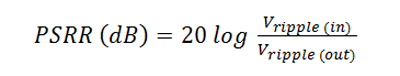 PSRR은 많은 LDO 데이터시트에서 공통적으로 표기하고 있는 사양이다. 이것은 LDO의 입력에서 출력으로 특정 주파수의 AC 성분을 얼마만큼 감쇠시키는지 나타내는 것이다. PSRR은 다음과 같은 방정식으로 표현된다.