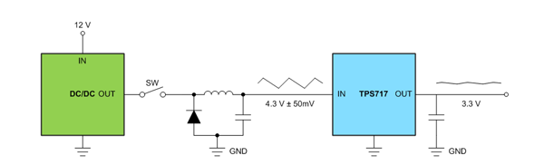 그림 1에서는 DC/DC 컨버터가 12V 레일로부터 4.3V를 레귤레이트하고 있다. 그런 다음에는 PSRR이 높은 LDO TPS717을 사용해서 3.3V 레일을 레귤레이트한다. 스위칭으로부터 발생되는 리플이 4.3V 레일에서 ±50mV에 달한다. LDO의 PSRR이 TPS717 출력에서 남아 있는 리플의 양을 결정할 것이다.