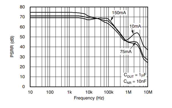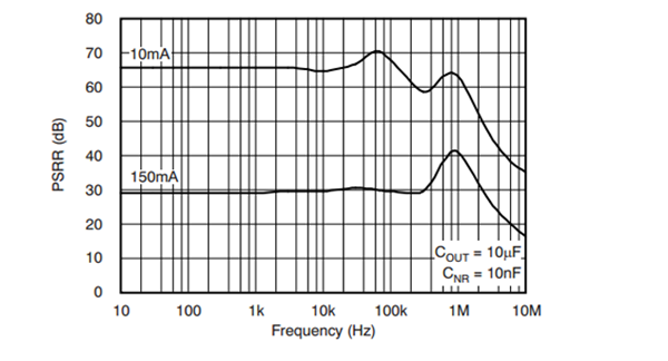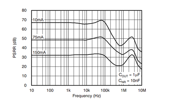 그러므로 VIN – VOUT 델타가 드롭아웃 전압에 근접함에 따라서 PSRR이 감소한다. (드롭아웃 전압은 다른 어떤 요인들보다도 출력 전류에 따른 함수임을 명심해야 하며, 따라서 출력 전류가 낮을수록 드롭아웃 전압이 감소하고 PSRR을 향상시킨다.)