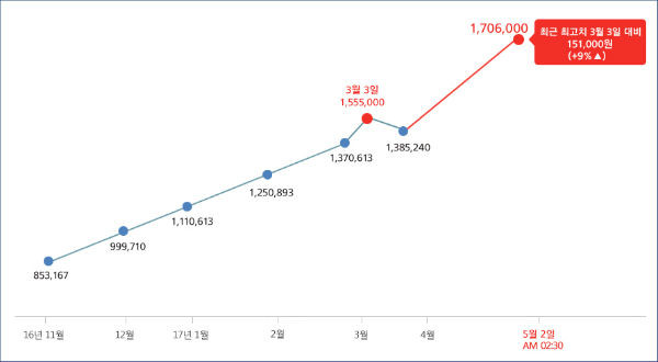 [IT비즈뉴스 한지선 기자] 가상화폐 비트코인이 또 한 번 최고가를 갱신했다. 5월2일 오전 2시30분경 비트코인이 1,706,00원을 기록하면서 3월 초 최고치를 기록했던 3월3일 1,555,000원에서 9% 상승했다.