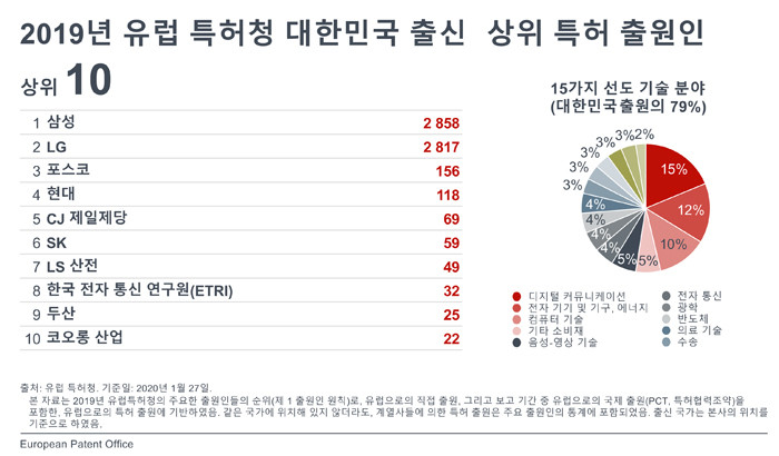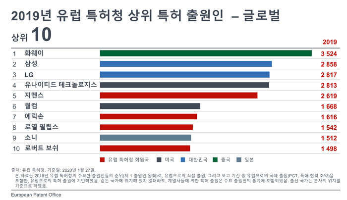 EPO 전체 상위 특허출원인 순위에서 한국기업 중 삼성과 LG가 각각 2위와 3위를 차지했다. 1위는 화웨이가 차지했다. 삼성과 LG를 이어 유나이티드 테크놀로지스(4위), 지멘스(5위)가 각각 뒤를 이었다.