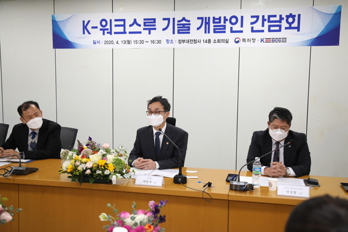 특허청은 13일 정부대전청사에서 최근 코로나19에 대한 신속하고 안전한 진단방법으로 각광받고 있는 한국형 워크스루 장비를 개발한 발명자들과 간담회를 가졌다. 이날 자리는 워크스루 발명자들과 개별적으로 지식재산권(IP) 보호와 해외시장 진출 지원을 진행한 결과를 공유하고 향후 계획을 논의하는 자리로 마련됐다.
