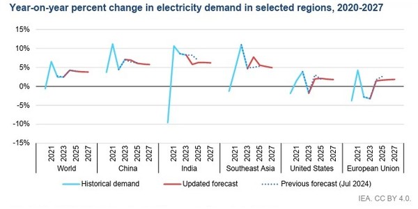 보고서에 따르면, 지난해 7%의 증가율을 기록하면서 전세계 전력 수요 증가의 절반 이상을 차지한 중국은 2027년까지 연평균 6%, 인도는 연평균 6.3%의 증가율을 기록하면서 전세계 전력 수요 증가세를 선도할 것으로 예상된다.