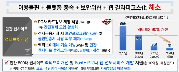 KISA에 따르면 2017년 810개에 달하던 민간 500대 웹사이트의 액티브X 수는 2018년 510개, 지난해에는 143개로 감소했다. 이를 81개로 수준으로 줄이는 게 목표다. 이와 함께 웹브라우저 업그레이드 캠페인, 웹 개발자 대상 HTML5 교육 등도 진행한다.