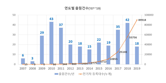 특허청에 따르면 전기차 관련 전력서비스 특허출원은 2008년에는 연 3건에 불과했으나 2009년~2011년에는 연평균 36건, 2012년~2016년에는 연평균 18건으로 감소했다가 2017~2019년에는 연평균 31건으로 다시 늘었다.