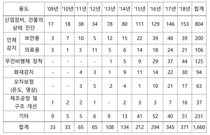 건강과 안전에 대한 관심을 반영하듯 보안용, 의료용, 화재감시용이 각각 12%, 6.4%, 5.7%를 차지하고 있으며 최근 5년간 출원량도 이전 5년 대비 각각 3.4배, 2.6배, 9.8배 증가했다.