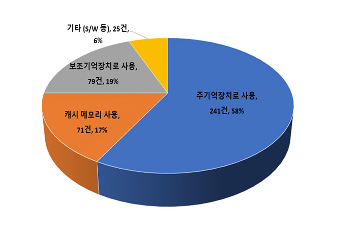 스토리지 클래스 메모리를 보조기억장치로 사용하는 기술(19%), 주기억장치와 보조기억장치의 처리 속도 차이에 따른 병목현상을 개선하기 위해 스토리지 클래스 메모리를 캐시메모리로 사용하는 기술(17%) 순으로 조사됐다.