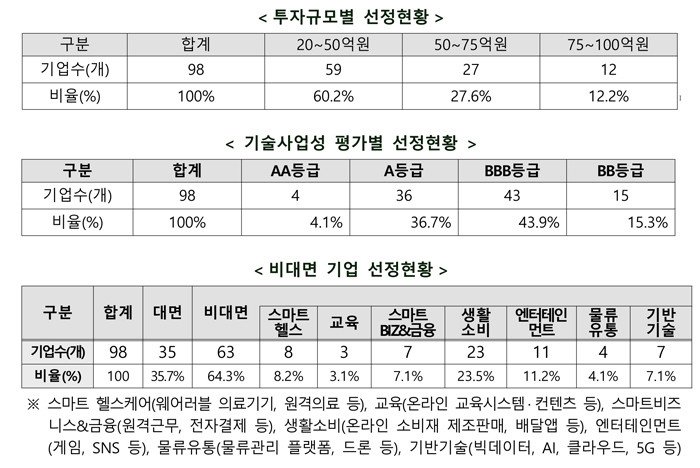 업종별로는 ICT 및 D·N·A(Data/Network/AI) 기반 플랫폼 분야 스타트업(49개)이 다수 포함됐다. 바이오헬스 분야(29개), 일반 제조 및 서비스 분야(20개) 순으로 많았다.