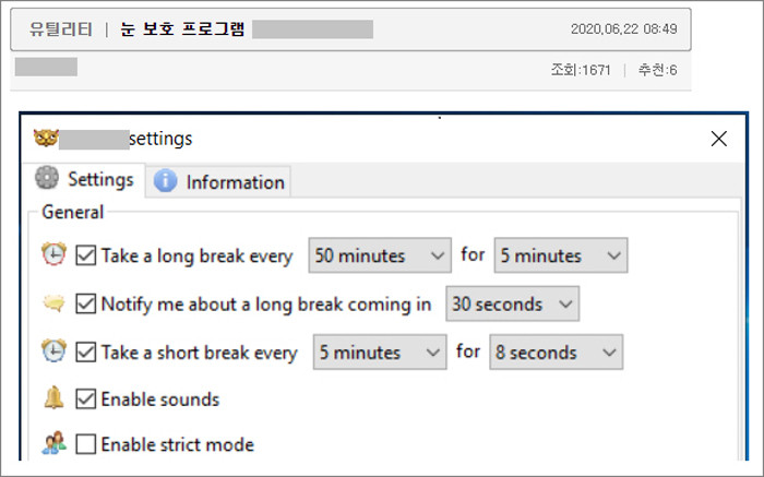 23일 이스트시큐리티에 따르면, 해당 악성파일이 포함된 게시물은 22일 오전 8시 49분경 등록됐다. 당일 기준 약 1600여명이 조회한 것으로 확인됐다. 악성파일은 ‘시력 보호 프로그램’을 사칭하고 있으며 23일 현재 게시물은 삭제된 상태다.