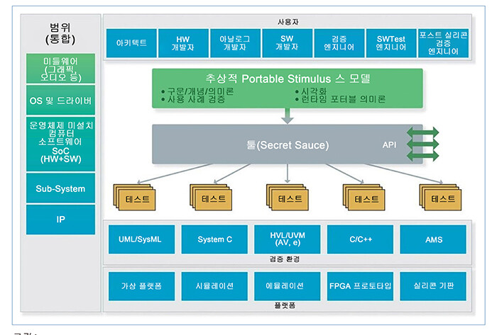 엑셀러(Accellera) PSS(Portable Test and Stimulus Standard) 언어는 바로 이런 요구사항을 지원한다. 즉 테스트 시나리오를 다양한 검증 레벨(블록/서브시스템 및 SoC)에서 재사용할 수 있고 여러 실행 환경(시뮬레이션, 에뮬레이션 및 프로토타입 등)에 걸쳐서도 재활용할 수 있는 형태로 포착한다. 그림 1에서 쉽게 확인할 수 있다.