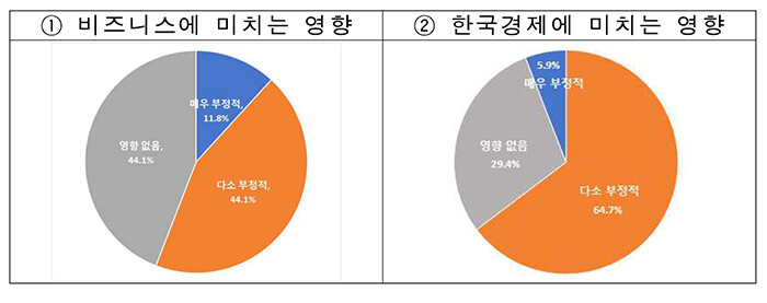 홍콩보안법 사태에 따른 한국경제 영향에 대해서도 부정적 영향을 전망한 기업이 70.6%에 달했다. 지난달 1일 홍콩국가보안법의 전격 시행된 점, 같은 달 14일 미국의 홍콩 특별지위 박탈에 따라 홍콩진출 한국기업이 자사 사업환경 및 한국경제에의 영향을 부정적으로 전망했다.