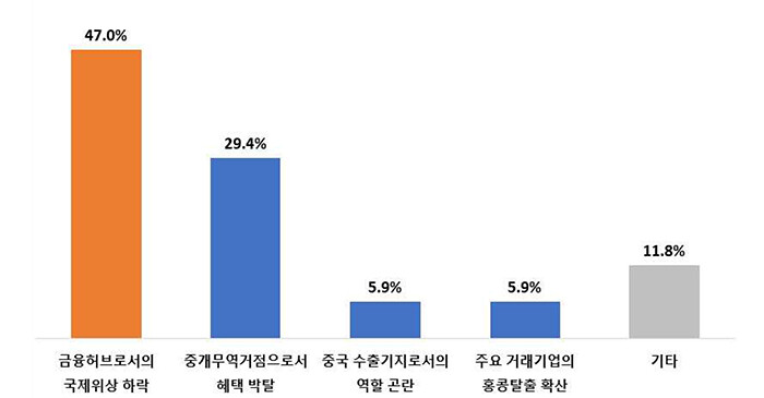 특히 향후 홍콩 이외로 아시아금융허브가 대체된다면 88.2% 기업이 싱가포르를 대체지로 예상했다. 서울이나 부산 등 한국을 대체지로 응답한 기업은 없었다.
