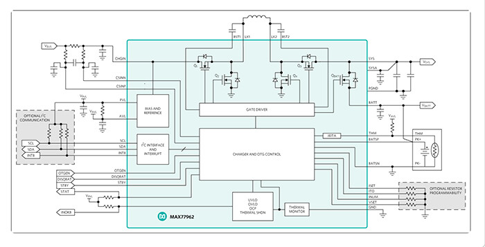 새로운 USB-C PD 벅부스트 충전기인 MAX77962는 동급 대비 절반 크기로 28W의 충전 전원을 제공할 수 있는 고전압 FET(30V 최대절대전압)가 내장됐다. 모든 전원 FET를 통합해 솔루션 크기를 절반으로 줄이고 3.5V~23V의 넓은 전압 범위로 2S Li+ 배터리를 28W로 급속 충전할 수 있다.