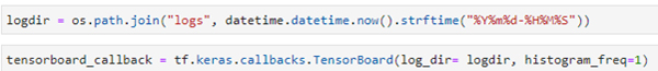 만약 Keras를 사용하는 프로그램의 경우 model compile 다음에 로그 지정 디렉토리와 tensorboard_callback을 지정하고,