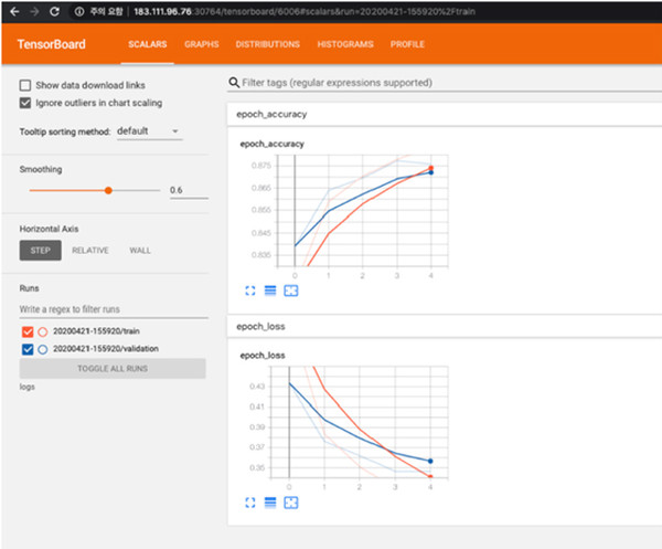 만약 훈련 손실률과 정확도 그리고 개발용 손실률과 정확도를 비교한다면 텐서보드가 무척 깔끔하게 처리된 시각화 화면을 제공한다. 즉 여러 시도들을 비교하여 epoch 증가에 따른 변화를 관측하기에 편리하다.