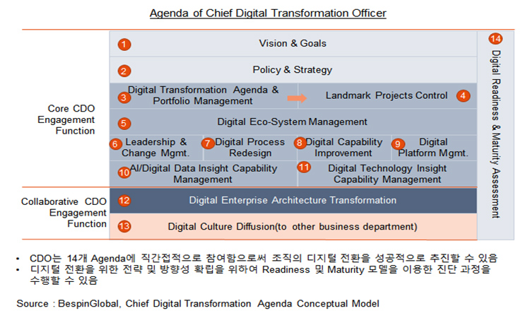 이 글에서는 다양한 조직 중에서도 특히 금융기관의 최고디지털책임자(Chief Digital Transformation Officer, CDO)가 DT를 성공적으로 이끌기 위해 직간접적으로 참여해야 하는 중요 아젠다(Agenda)를 두 차례에 걸쳐 살펴보고자 한다.