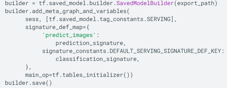 1. 우선 서버(클라우드)에 있는 MNIST 분류 머신러닝 모델이 아래와 같은 코드가 모델을 서비스하도록 추가되어 훈련이 끝나 있어야 한다. 자세한 사항은 텐서플로우 서빙 모델 편을 참고하기 바란다.