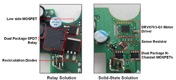물론, 릴레이가 값이 싸고 설계가 간단하지만, 수명이 제한적이고 솔루션 크기가 커서 이제 첨단 모터 애플리케이션에 사용하기에는 부담스러운 면이 있다. 그러므로 자동차 모터 제어 애플리케이션에 조용하면서 작고 안전한 솔루션을 제공하기 위해서는 솔리드 스테이트(반도체) IC를 사용하는 것이 최적의 선택이다.