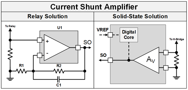 이렇게 높아진 전압을 마이크로컨트롤러(MCU)의 아날로그-디지털 컨버터(ADC)로 보내면, MCU의 디지털 로직이 모터의 작동을 멈출지 전류를 제한할지 등을 결정할 수 있다. 그러나 솔리드 스테이트 모터 드라이버는 이 로우 사이드 전류 션트 증폭기를 통합함으로써 외부 소자로서 하나의 전류 감지 저항만을 필요로 한다. 그림 2는 통합 모터 구동 IC와 개별 전류 측정 회로 토폴로지의 차이를 보여준다.
