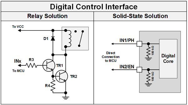 릴레이 솔루션에 동일한 입력 제어를 달성하기 위해서는 릴레이 내부의 솔레노이드 코일을 제어하기 위한 특정 전류 이득이 필요하다. 그림 3은 릴레이와 솔리드 스테이트 드라이버를 MCU로 인터페이싱할 때 회로 토폴로지의 차이점을 보여준다.
