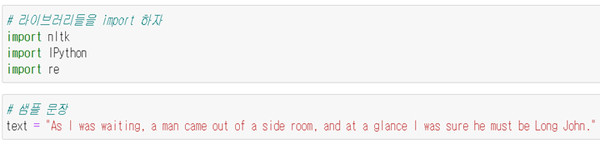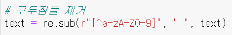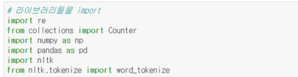 우리가 관심을 같는 것은 단어이기에, 나머지 부호는 무시하는 것이다. 여기서 re.sub 표현은 파이썬 언어의 re라는 라이브러리를 처음에 import 한 것을 알 수 있다.