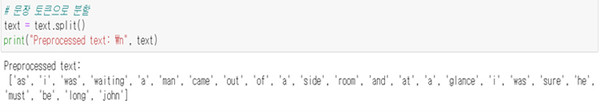 text = text.split()을 통하여 문장 [As I was waiting, a man came out of a side room, and at a glance I was sure he must be Long John.]이 ‘as’, ‘i’, ‘was’, ‘waiting’,….’john’와 같이 토큰으로 분할 된 결과를 볼 수 있다. 분할된 as, i, 와 같은 개체가 토큰이다.