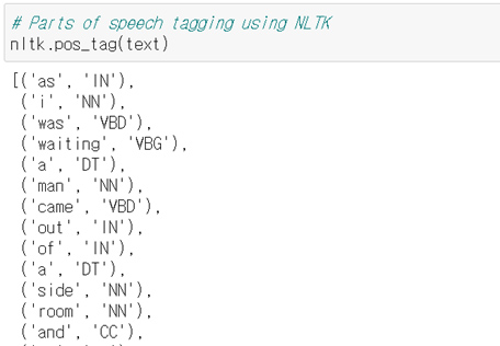 분할된 토큰들이 text에 담겨있는데 이를 nltk.pos_tag(text) 와 같이 파이썬 nltk 라이브러리의 pos_tag라는 함수에 넣으면 그 아래 표시되는 것처럼, as는 IN과 같이 꼬리표(tagging)가 붙는다.