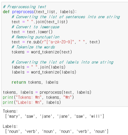 만약 text = [“Mary saw Jane”, “Jane saw Will”] 이라는 문장이 있을 경우, preprocess 라는 함수를 통해 소문자변환, 구두점 제거, 토큰화 이후에 Tokens에는 Text에 있던 문장이 토큰으로 분할되었고, Labels에는 해당되는 품사가 분할되어 있음을 볼 수 있다.