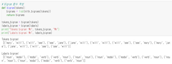이제 nltk.bigram 함수를 통하여 Token 과 Labels 의 bigram 을 생성한다.