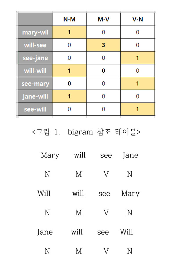화면에 출력된 Tokens bigram 쌍들을 N-M, M-V, V-N 등의 품사 전이 컬럼과 아래와 같이 매칭해본다. 여기서 N은 Noun(명사), M은 Modal(can-will 과 같은 조동사), V는 Verb(동사)이다.