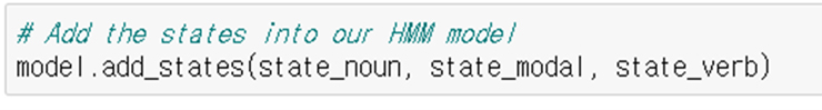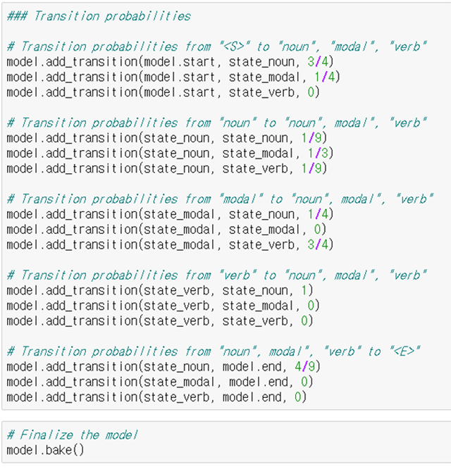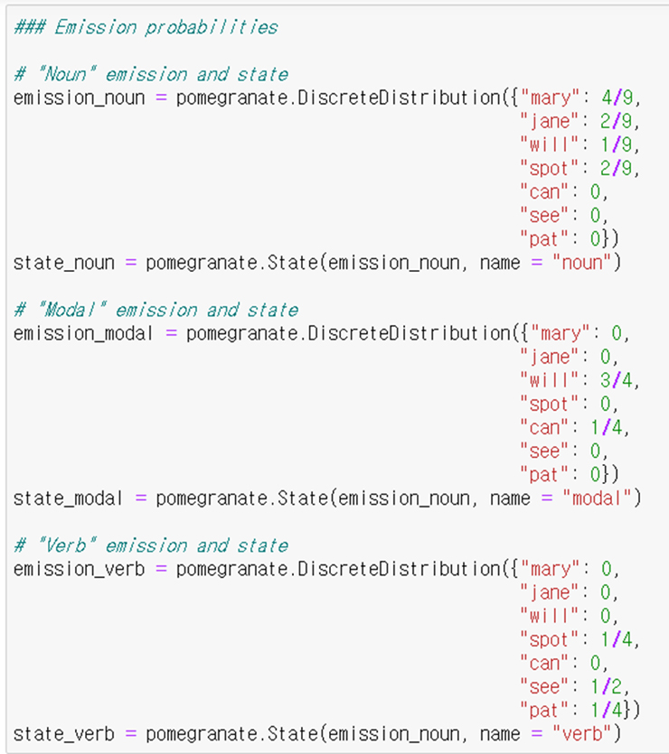 그리고 아래와 같이 품사별 표출 확률들을 pomegranate에 입력해준다.