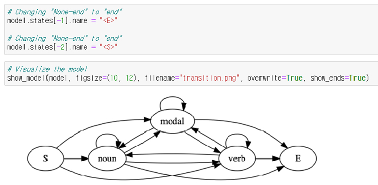결국, pomegranate.HiddenMarkovModel()의 연산을 통해 Jane will spot Will 이라는 문장의 POS 는 '<S>', 'noun', 'modal', 'verb', 'noun', '<E>' 이라고 찾아낸다.