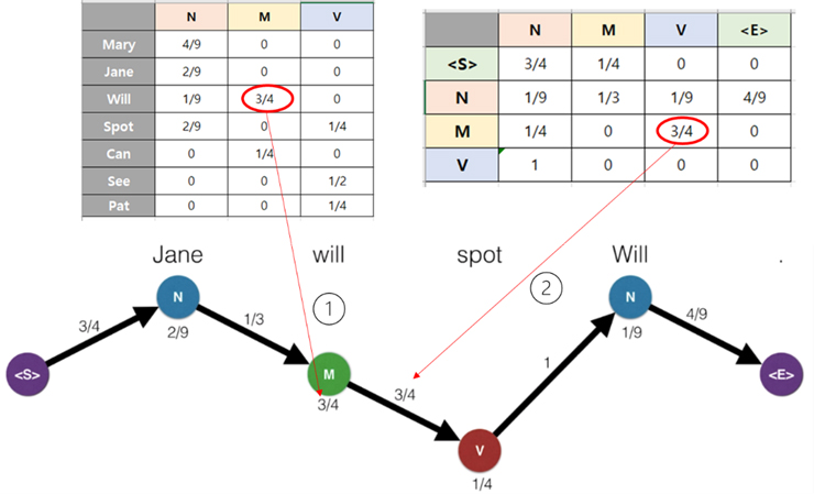 아래의 그림에서 ①은 왼쪽 위의 테이블에 나타난 바와 같이, will이 M의 상태일 경우에 값이 3/4 임을 가리키고 있으며, ②는 오른쪽 위의 테이블에 표시된 바와 같이, 품사가 <s>에서 시작하는 방향에서 M에서 V 로 이전하는 상태일 경우 3/4 임을 가리키고 있다.