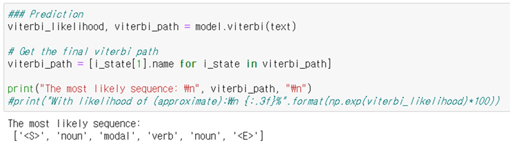 Pomegranate 의 model.viterbi 함수를 통하여 HMM은 아래와 같은 품사 값을 예측해낸다.