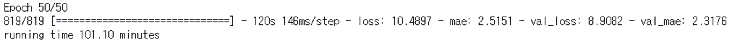 지금까지 2회에 걸쳐 기상 관련 8년간 10분 간격으로 측정된 시계열 데이터세트를 이용하여 순환신경망으로 24시간 후의 온도를 예측하는 것을 살펴보았다. 그림11의 훈련을 50 epoch 수행하고 난 결과는 아래와 같다.